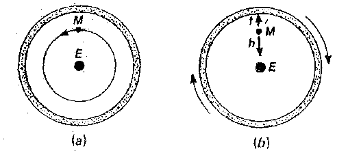 (iii)图1--1代表地球。月球宇宙系统.其中宇宙用一个具有很大质量的球壳来代表。图1--1(a)代表“通常的”观点,图1--1(b)代表相应的相对性的观点,即月球静止而宇宙旋转。我们已指出,按照马赫的说法,“惯性定律必须这样来表述:从第二种假定得到的结果与从第一种假定得到的完全相同.”因此,旋转的宇宙必须提供一离心力场,以抵消地球的引力(也就是使地球在赤道附近鼓起来的力).宇宙还必须提供科里奥利力,这个力具有使傅科摆的平面发生转动的附加效应.由直接类比,可以期望在每个具有质量的旋转的壳体内部都呈现微小的离心力和科里奥利力,这是另一种完全非牛顿的效应**.再由图1--1(a),为使地球从静止得到某一给定方向的加速度,必须对它施加某种力(例如用火箭).但也可以这样解释:地球需要一个力以保持它在作加速运动的宇宙中不动;再引伸一步,只要质点附近的物质作加速运动,我们就可预期它受到个个为的作用,其方向和加速度的方向相同.