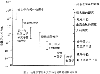 当代物理学的研究表 明, 物质结构在尺度上和能量上都呈现不同的层 次( 见图1)。明确了物质结构的不同层次之后, 当代物理学的分支学科如何划分的问 题, 也就迎刃而解了(见图 2)。 最微小(也是能量最高)的层次是粒子物理学(也称为高能物理学) ,然 后是原子核物理学,再上去就是原子物理学和分子物理学。原子或分子聚集起来构成了不同的聚集相:气相 、 液相和固相,乃至于固液之间的中介相 ,如 液晶 、 复 杂流体与聚合物等软物质 。另 一类气相 (由宏观中和的正负带电粒子所构成的)就是等离子体 ,相 应的是等离子体物理学 。大 尺度的固体与流体运动的研究归结为固体力学与流体力学。聚集相的复杂组合构成了岩石、土壤、河流、山脉、湖泊、海洋及大气等,成为地球物理学的研究对象;而细胞、器官、植物、动物及人体构成了生物物理学的研究对象。继续扩大物质研究的空间尺度,就引导到空间物理学和行星物理的领域。进而包括太阳、恒星、星系、星系团,乃至于整个宇宙,都构成了天体物理学和宇宙论的内容。在这里似乎遗漏了一些传统物理学的分支学科,如光学与声学。目前的情况是,它们的部分内容正在朝向偏重技术的工程学科转化,而另一部分则和某些结构层次的物理学相结合。例如光物理学就和原子与分子物理学密不可分,也和凝聚态物理学关系密切;而物理声学则与凝聚态物理学及固体与流体力学密切相关。 从物质结构层次化的图表来看,物理学的主要空白区域突出地显示为图表的底部和顶部。其一是尺度上最最微小但能量最高的世界,对应的学科为粒子物理学(亦称高能物理学);其二是最最宏大的世界,即天体与宇宙,对应的学科为天体物理学与宇宙论。这两者,表面上看来,南辗北辙,结果却殊途同归,有合二为一的趋向,奇妙地体现了大与小辩证的统一。粒子物理学所面临的挑战在于探索更加细微尺度下,也就是更高能区物质结构的规律,希望能够超越现有的标准模型,追求相互作用的进一步统一。而宇宙大爆炸的标准模型则表明早期的宇宙是处于超高能的状态。因而高能物理学的研究,从某种意义上来说,是对宇宙进行考古学的研究。提高研究的能量范围,就等于追溯到更早期的宇宙。高能物理和天体物理的实验研究都属于大科学的范畴。大科学威风凛凛,但大也有大的难处,正如《红楼梦》中王熙凤所说的,大科学所面临的问题在于如何持续地获得社会的支持。在冷战时期,巨型加速器成为国力的象征,理所当然地得到了国家的支持。冷战以后,情况显然有所不同,需要考虑这类基础科学研究的社会效益问题。美国超级超导对撞机的下马似乎暗示了:即使像美国那样的富裕发达国家,对大科学项目的支持还是有条件的。看来今后的出路在于走国际合作的道路。对这两个前沿而言,目前是机遇和挑战并存。 除了这两个很明显的前沿外,应该还存在一个前沿问题,即存在于结构层次之间,总的说来,就是朝复杂物质展开:固体物理早期所研究的多半是简单的物质。在进一步研究中,方始接触到比较复杂的物质,当中蕴含有许多尚待发物理展 、 挖掘的物性。下面以半导体为例作些说明。最简单的硅,研究得最清楚,应用得最广泛;然后是复杂一点的碑化镓这类化合物半导体 (Ⅲ-Ⅴ族与Ⅱ-Ⅳ族);更进一步就涉及结构更加复杂的聚合物半导体。近年来,聚合物半导体研究十分引人注目,己能做出聚合物晶体管来。当然 ,聚 合物的集成电路在当前还不能与硅片竞争,但它有廉价 、 容易制备的优 点, 因而可以在其他方面发 展。由 聚合 物, 我们想到人的大脑问 题, 大脑里头并没有硅 片,但 大脑思维复杂程度远远超过现代大型计算机。故从简单物质的研究到复杂物质的研究的发展过程中,物理学应该是大有用武之地 的。 所以我们可以认 定, 除了前面两个 (实际上已经合二而一了的)前沿外,应该还存在另一个物理学前沿,即探讨复杂物质的结构与物性。 3.2 复杂与简单的辩证关系 下面讨论一下复杂与简单的辩证关系问题 ,这 里牵涉一点哲学观点的问题 。因 为物理学所研究的是一些最基本的问题,所以在探索和深入到一定程度后,某些哲学观点就会呈现出来了。 物理学家惯用的一个观点往往是还原论。所谓还原论 ,就 是将世界分成许多小的部分 ,每 一部分研究清楚了,最后拼起来问题就解决了。这个观点是很自然的,物理学家过去受到的是这个训练,基本上就接受这一观点。有很多著名的科学家支持这个观点,鼎鼎大名的爱因斯坦就讲过:“物理学家的无上考验在于达到那些普适性的基本规律,再从它演绎出宇宙”。这可以说是爱因斯坦的雄心壮志,也是几代物理学家抱有的看法,就是说,如果我们把世界基本规律搞清楚了,那么就一切事情都解决了。下面是著名理论物理学家狄拉克讲的话,他讲这一段话的时候正好是在量子力学初步建立之后,他说:“现在量子力学的普遍理论业已完成,作为大部分物理学与全部化学的物理定律业已完全知晓,而困难仅在于把这些定律确切应用将导致方程式太繁杂而难以求解”。他的意思是基本的物理规律已经知道了,下面似乎就是一个求解的问题,至于求解,由于方程过于复杂,似乎有些问题还解不出来。 尽管有许多物理学家是抱有这类观点,但现在来看问题似乎不这么简单,基本规律知道了,具体规律是不是