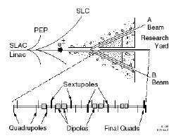 为压缩电子束团,亚皮秒脉冲源在波峰值以下对其进行加速(如顶右图所示)。这样,束团的一端比另外一端具有更多的能量。当束团经过束团压缩磁铁时,其能量较低的头部走较长的路(如上左图所示),尾部追赶(如上右图所示),从而有效地将束团旋转为更短。 通常情况下,直线加速器在波峰值时对电子束团进行加速,与在海浪尖上冲浪一样。在冲击斜坡时,可对束团加以调整。在波的倾斜处,当坡度下降时,束团接收到较少的能量。在阻尼环到直线加速器这一段里,束团像个爬波的冲浪者:束团的前端比后端具有更多的能量(也就是说,更接近峰值)。通过弯转磁铁的弯道时,低能尾部走最短的路,并追赶头部,从而使束团更短。 束团压缩的第二步在第10段的压缩磁铁进行。第10段的压缩磁位于直线加速器的三分之一处,电子在这里的能量已被加速到9 GeV,束团被倾斜,稍处于波峰值之前,所以后端比前端加速得更多。进入束团压缩磁铁后,较高能量的尾部能够走最短的路,并再次追上,从而将束团压缩到50微米。Paul Emma计算这正是使束流弯转的地点。Lynn Bentson监督了束团压缩磁铁的安装,Cherrill Spencer设计了束团压缩磁铁。他在设计这些磁铁时采取了一种方法,不让束团中有任何光相位差。 压缩束团的最后一步只有在SLAC才能做到,即沿其余1.3 英里的直线加速器获取能量和采用以前认为讨厌的效应。电子束团以光速运行时产生尾波(与船形成的尾波相同),称为尾场。在自由空间里,尾波将向垂直于电子运行的轨道展开,但在束流管道里,束团头部形成的尾波从管道上反射并干扰尾部。 因此,束团到达直线加速器尾部时,尾部的能量比头部少。幸运的是,束团可通过最终聚焦测试束流(FFTB)发送(图中的Final Focus Test Beam)。在FFTB处,束流线先向右然后向左微动。这一几何关系迫使能量较高的前部走较长的路,尾部紧跟。在这里,束团已经再次旋转,现在是12 微米长。在这一长度,210亿个电子的束团在一固定点处于80飞秒内发生旋离。(右下图为FFTB) Krejcik说:“我们需要一种测量束团长度的方法,所以工程的第二部分正在发明新的技术,以便在亚皮秒的时间范围内进行测量。” 亚皮秒脉冲源合作组修复了20世纪60年代首次在此使用的使束流向垂直方向偏转的专用加速腔,并将其插入到束流线里。当速调管将其打开时,该横向偏转腔通过在屏幕上垂直对其扫描对束团取样。束团长度为50微米时,在屏幕上垂直的长度给出束团长度的投影。该合作组正在开发光电取样技术,借鉴世界上快速激光技术,以测量最后聚焦测试束流中的束团。 亚皮秒脉冲源将在下两个财政年度运行,从产生亮度更高的X射线的直线加速器相干光源(自由电子激光)(左图为LCLS的示意图)取数据,超短束团也将用于E-164实验。