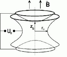 图1    彭宁阱中盖电极和双曲面环电极   由于电势关于z轴是对称的,整个电极是由两个盖和一个环组成的。令z0和r0分别为阱中心到盖电极和双曲面环电极的最小距离,并使     则V0应当是盖极板相对于环极板的电势,在典型的彭宁阱中z0和r0的选择如下:     由于电场的引进,带电粒子在垂直于磁场平面内的运动也将发生变化,下面来研究粒子的运动情况。对于均匀磁场,        (4) 设     从方程(7)-(9)可以看出,z方向上的运动是独立于x,y方向上的运动的。它是一个以 为解出xy平面内的运动方程,设 设方程(10)的解为     上式的解为:     由上式知    上式对V0提出了要求,即V0的值要满足上述关系,如果V0的值超出上述要求的范围,电场的非稳定性将超过磁场的约束力范围,带电粒子就不能被束缚了。方程(12)和(13)表明,带电粒子在xy平面内的运动是两个圆周运动的合成,圆频率分别为   这里  图2  彭宁阱中带电粒子运动轨迹    3 实验进程   实验进程包括如下几个步骤:利用真空装置产生高真空实验环境;利用电子束轰击离子束产生高电离态离子;利用离子态选择磁场来选择实验所需要的电离态;离子传输系统,利用传输装置把高电离态离子运送到彭宁阱中;产生氢分子离子(或其它离子)做参考离子,在彭宁阱中测量频率。离子进入阱中以后,分别对待测离子和参考离子围绕共振频率附近进行21次测量,并分别测量其排出阱外后的飞行时间,因为在共振态的离子具有最短的飞行时间,从而确定哪些离子是处于共振态的离子。每次测量时间为1秒,离子之间的转换时间很短,总共只需几秒的时间。这样,对待测离子和参考离子分别测量21次所需要的时间为1.5分钟左右,这称为一次扫描。在一个实验中,一般要进行30次扫描,以达到利用统计分析的办法得到最精确的数据。在测量飞行时间时,离子从阱中排出后,飞行30cm的距离遇到一个探测器,从而能够测量离子的飞行时间,在此探测器前还放置一系列网格探测器用来测量离子的能量,从而可以对质量进行相对论修正。   在最近的实验中(2001年在瑞典斯德哥尔摩大学物理系所做的实验),对汞原子的198Hg和204Hg进行了测量,得到的数据分别为197.966 768 4(6) ,203.937 494 2(6),这一数据很好的支持了另外的实验结果。   根据实验情况和当前的实验技术,为了使测量精度进一步提高,还应该从以下几个方面进行研究:进一步提高磁场的稳定性和阱电压的稳定性,这要提高超导磁场的性能;减少离子间的相互作用及离子与剩余气体的相互作用,这需要提高真空度。随着实验技术的不断提高,原子质量测量的工作也会越来越精确。 ![]() 导航:尖子网/港湾/物理/粒子物理 |