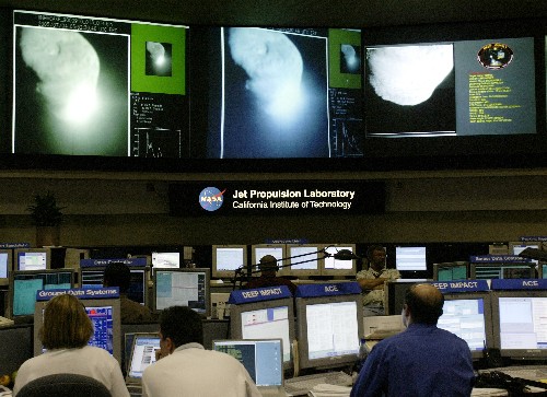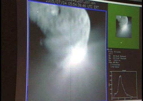 2005年7月4日,美国宇航局的电视屏幕显示“深度撞击”号探测器释放的撞击器“击中”目标――坦普尔1号彗星。 新华社/法新