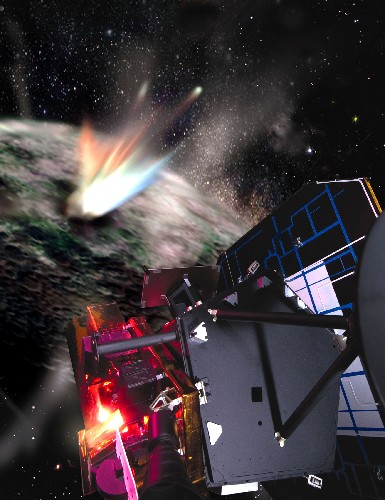 这张由球形航空宇宙与科技公司发布的未标明日期的概念模拟照片显示的是,坦普尔1号彗星(画面左上方)被“深度撞击”探测器(画面右方)发射的撞击器击中时发生爆炸的场面。