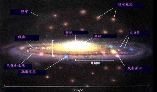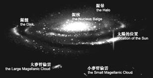 哥自尼的宇宙体系实际上描述的是太阳系,而在牛顿看来,无数天体通过引力互相牵制,总体上处于既不膨胀、也不收缩的均匀、稳定的状态。 到了18世纪中期,瑞典人斯维登堡(1688~1772)、英国人赖特(1711~1786)相继对这种稳态的宇宙产生了怀疑,他们推测由大量恒星组成的“银河”是一个相对完整的体系,而太阳系就位于这个形状像“磨盘”的银河平面内,甚至还提出了太阳系可能并不在银河系中央的看法。 著名的天文学家弗里德里克·威廉·赫歇尔(1738~1822)和约翰·赫歇尔(1792~1871)父子通过不懈的系统的观测,用大量事实有力地提出“银河是一个星系”的观点。赫歇尔父子及老赫歇尔兄妹用亲手制作的望远镜,先后探察了北半球1083个天区共计11万多颗星,为此,老赫舍尔兄妹投入了毕生的精力,以至妹妹终身未嫁。老赫舍尔去世后,小赫舍尔把观测基地迁到南非好望角,在地球的南半球共探测了2299个天区计70万颗星,第一次为人类确定了银河系的盘状旋臂结构,把人类的视野从太阳系伸展到10万光年之遥。至此,人们才惊奇地发现,一向认为大的不得了的太阳系,只不过是银河系边缘上的一个不起眼的小小成员而已(图4-10)。赫舍尔家族为观测和发现银河系做出了不可泯灭的贡献。他们论述的银河系结构在今天看来尽管不甚准确,但他们的工作却构成了继哥白尼以后开拓宇宙视野的第二个里程碑。正是有了赫舍尔家族的观测资料和前期工作,才使沙普利在1918年得出了“银河系是一个透镜形庞大天体系统,其直径大约10万光年,太阳处于离中心近3万光年的一条旋臂上” 的正确结论。这个结论离今天的精确观测数据已经非常接近。现代的观测证实,银河大约包含1000亿颗恒星,这些恒星聚集成铁饼形状(图4-11),直径约为10万光年,中间厚度约1万光年,已经发现它有四条旋臂,目前太阳系就处在这铁饼中离中心近3万光年的地方,而在恐龙灭亡的时代,太阳系正好处在旋臂以外的位置上。由于地球上只能从侧面看到这一群星,再加上肉眼不能细辨,所以就银河系被人们看成是横穿太空的一条亮河。