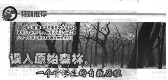 抓了一条蛇后迷了路  去年9月19日,刚好是周六休息。午后3点多,章志阳从一家书店出来后,便想一个人上山玩,顺便还可以采些红菇、黄花菜什么的。 通往虎头山的山间小道,他并不陌生。起初是小跑上去的,很快就登上了主峰。这时,他已玩得忘了时间,强烈的好奇心让他的步伐加快了,主峰的后面会有什么新奇的东西呢?他想走进去探个究竟。 章志阳自己事后也觉得奇怪,怎么那时他一点都不想回家,而且路好像总在他面前适时拓宽、延伸。这时,一条小蛇正悠然自得地从林子里爬出来,像是迎接他似的。志阳从不怕蛇,他知道怎么对付它。他随手捡起一根棍子,朝蛇打了一棒,然后就抓住还在动的蛇头,说了句跟我走吧,便继续往林子深处走去。 好像是翻过一个分水岭,穿过一个峡谷,游兴正浓的章志阳仍不知疲倦地跑着。起风了,树叶发出种种怪响,好像后面有人嘻嘻哈哈地追他,又好像前面有人嘻嘻哈哈地召引他……渐渐觉得手里半死不活的蛇不好玩了,便扔了。这时,路突然莫名奇妙地断了,消失了。幕色四合,天快黑了。 再回头一看,蛇不见了,路也不见了,笼罩在他四周的是阴森森的雾,左边是树,右边还是树,前面是齐身的芦苇,后面还是齐身的芦苇。置身何处,只有鬼知道了。这时,他开始想回家,开始后悔一个人贸然进山,也开始后悔没事先与父母打招呼…… 他怎么也想不到,自己已进人方圆近80平方公里的茂密大森林之中,而再往里走,就是神秘的原始森林,人称鬼地方,或无人区。曾经有人莫名地失踪在这里,民间一般用锣鼓来呐喊,死去的无完尸,生还的也是半痴半疯、双目失神地胡言乱语。 天很快暗了下来,章志阳虽然有点后悔,但他一点也不怕。听听怪鸟的叫声,踩着松软的落叶,也挺刺激的,荒山野岭,自有它的奇妙之处,只是章志阳的眼睛有点睁不开了,因为有飞虫像沙一样地扑来…… 怎么办?他想,首先应搭个窝度过这漫漫长夜。 从树上摔下来,他想这下完了  伸手不见五指。死一般的沉寂,鸟不叫了,虫也不吭声了。 有磷火在飞舞,章志阳明白,这不是鬼火。偶尔有野猪出没的声音,只是不见其身影。 对了,这里叫虎头山,如果老虎出来,那就问题大了。书上说,虎狼是不会爬树的,那么,最好在野兽光临之前,在树上做个吊床。 章志阳摸索着选中了一棵好爬的大树,大约爬了10米高,便脱掉脚上的鞋子,挂在树枝上;然后,折几把树枝,平放在树权间,一张临时的床就这样弄好了。他睡不着,一会儿躺着, 一会儿又坐了起来。突然,树权被压断了,章志阳来不及抓住树干和鞋子,便从树上掉了下来。刚好被一棵横伸向半空的小树拦腰托了一下,可落地时,又有一粗大的朽木横亘在腹部…… 他的头脑开始还很清楚,想,这下完了。可怎么也动不了,半晕半睡中他闭上了眼睛。不知过了多久,醒来时四周仍是漆黑一片。他感到冷和渴。对,需要喝水。隐隐约约,好像也听到了远处有流水声。水是生命之源,他命令自己必须爬着去找水。 可是,无法爬起来。无奈之下,闭上眼睛,凭直觉向流水方向派了下 去,刚好顺坡。大概滚了300米左右,一条小溪幽幽地出现了,章志阳伏在水边,猛喝一阵。他知道,流动的水是可以喝的。 也许是喝水用力过猛,也许是滚动中体力用尽,章志阳再次像是昏迷般睡去。第二天睁开眼一看,像是进了地狱,森林狰狞,杂草丛生,蜘蛛网七零八落,硕大无比的蚊子飞来飞去,不知名的山虫、蚂蚁爬满全身…… 什么叫痒,什么叫痛,已分不清了。他并不知道,此时家里人正在揪心地奔波寻找他。但谁会知道他在这深山看林里,而且摔成重伤:腰间软骨断洪右肝裂伤、结肠浆肌层裂伤、右膈肌挫裂伤、右脚脱挫裂伤、腹腔内积血…… 沿着野兽的脚印爬行  本以为睡了一夜体力会有所恢复,但四肢仍不听大脑调令。山上没野果,生红菇又不能吃,不过,可能是腹腔内淤血缘故,他并不感到饿,只是无力。原是短跑运动员的章志阳,现在只能望着树缝里的天发呆。记者采访时问他,当时哭了吗?他说,哭有什么用?并骄傲地告诉记者,自从他10岁以后就没哭过,10岁以后想哭也哭不出来,失踪时已10岁了,自然也不流泪…… 第二天的夜晚又降临了。 天空中没有月亮,可这时,他开始出现幻觉,整个山林灯火辉煌,有跳舞的丛影。置身其中,有一种说不出的舒服。但似乎又有一个声音在警告自己,不要沉缅其中,那是虚幻的,要感到痛,要睁开双眼,要远离那可怕的歌舞幻境…… 强烈的求生欲望,让他以坚韧的意志力,再一次熬到天亮,这已是第三天了。 他看到了自由的小松鼠。章志阳眨着眼睛想与它们交流一些什么,可是,它们不懂。很快,夜又一次辅天盖地地压来。清醒后,已是第四天的上午,感觉身体好了点,但几次想爬起来,仍无法成功。总不能等死吧?他想,登高可以望远,判断方向。于是,他决定顺着野兽的足迹爬向山顶,在这原始森林里,最好的向导,也许就是野兽的足迹。 听到伐木声后遇到救命恩人  可是,野兽的脚印让他做了不少无用功。他在迷宫中不知爬了多少冤枉路。神使鬼差的,总是爬不到边。不知翻越多少座山,不知穿过几个深谷,章志阳终于发现了一只盛松脂的小塑料袋,它挂在树皮上,里边有一些积水,他勇敢地喝下了,虽然那气味不好。章志阳似乎看见了救命的阳光,有塑料袋,说明这里有人来过,他们是采松脂的山民。也说明了爬的方向是对的。增强信心后,他的力气倍增。 这时,他在