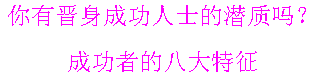 在事业上取得成功的人士,大都具备以下八大个性特点、对照一下,看看你自己有没有成为成功人士的潜质? 一、热衷比赛,求胜欲强。 成功人士与运动员颇相似,都有强烈的求胜欲望,不管是经营企业、骑自行车,或打扑克,都想拿第一,事事竭尽全力,精益求精。 二、把梦想付诸实施,而不仅停留在口头上。 定下目标后即做出实施方案,这些计划巨细无遗,时间、步骤-一列明。 三、不达目标不罢休。 成功人士一旦开始行动就无人可挡,不达目标绝不停止。 四、善从大局着眼。 考虑问题时会设想多个可能发生的情形,并作好对策。凡事从整体出发去作决定,不会一叶障目。 五、分步施行,减少出错。 成功者善把宏大的目标分成一个个易于达成的小目标来实施。处事谨慎,深知即使小小的出错也可能令全盘计划受阻。 六、勇担责任。 不少人渴求高薪厚禄却又伯担重贡。对成功人士而言,责和权是密不可分的,责任与收人是成正比。他们不伯挑重担,出了差错也勇于承担。 七、强烈自信。 成功者知道自己的强处在哪里,也不会刻意隐。遇到失败时,也能以健康的心态接受。 八、推销的专长 想出一项新产品是第一步,说服别人来习才是最困难的,这就是推销能力:坚定的意志、凭三寸之烂之去再加一点谋略。 ![]() 118 日本人的“中日友好”宣言:日本将于2015年灭亡中国 导航:尖子网/港湾/散文/生活拾偶 |